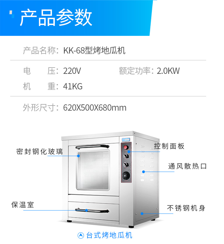 名稱KK-68型烤地瓜機(jī) 電源220V 功率2.0kw 產(chǎn)量 尺寸620×500×680mm 重量41kg 規(guī)格 其他