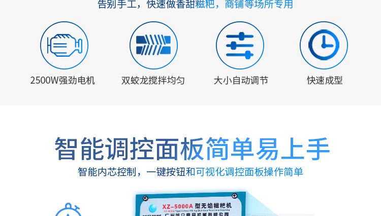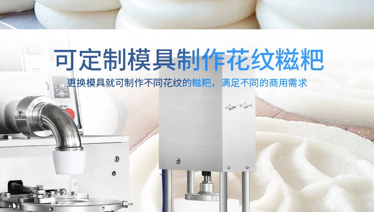 名稱XZ-5000A型無餡糍粑機(jī) 電源220/380V(見機(jī)器名牌) 功率2.5kw 產(chǎn)量0-5200個/小時 尺寸 1550×980×1300mm 重量280kg 規(guī)格20-180克/個 其他