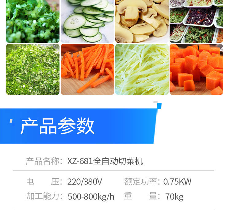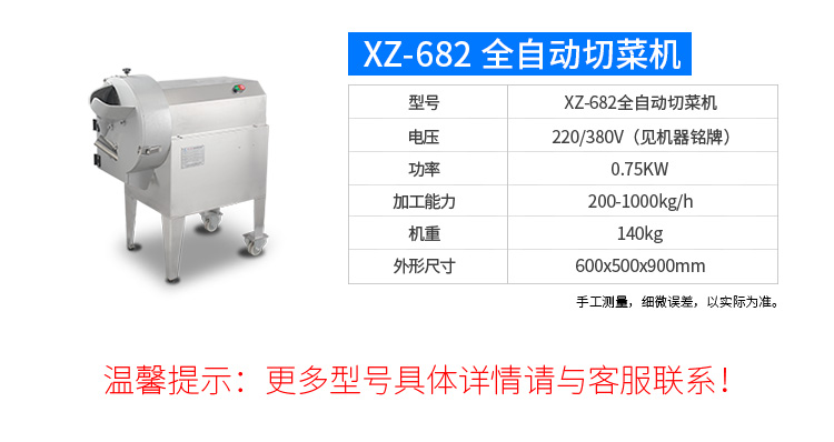 名稱XZ-681多功能切菜機(jī) 電源220/380V(見(jiàn)機(jī)器銘牌) 功率0.75kw 產(chǎn)量500-800千克/小時(shí) 尺寸770*460*1400mm 重量70kg 規(guī)格 其他