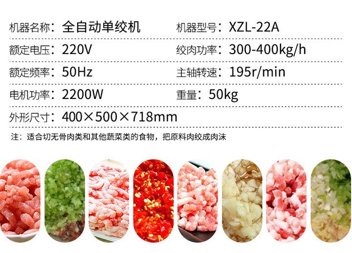 名稱XZL-22A絞肉機 電源220V 功率2.2kw 產(chǎn)量300-400kg/h 尺寸400×500×718mm 重量50kg 規(guī)格 其他