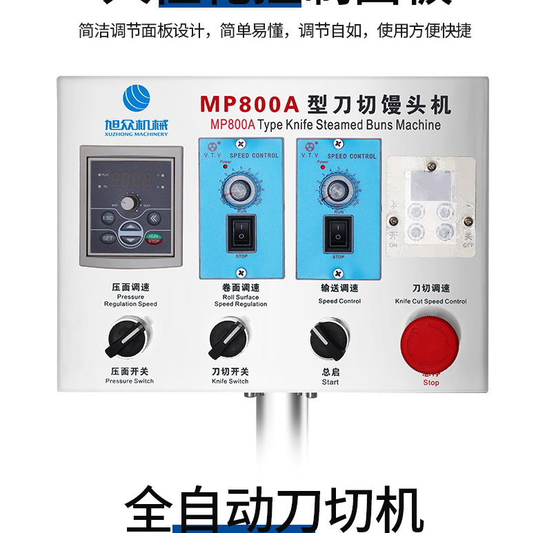 旭眾MP800A型刀切饅頭機(jī)采用高品質(zhì)微電腦控制,人性化的控制面板,控制準(zhǔn)確可靠,操作簡(jiǎn)單,可生產(chǎn)各種刀切饅頭、花卷等面食產(chǎn)品。