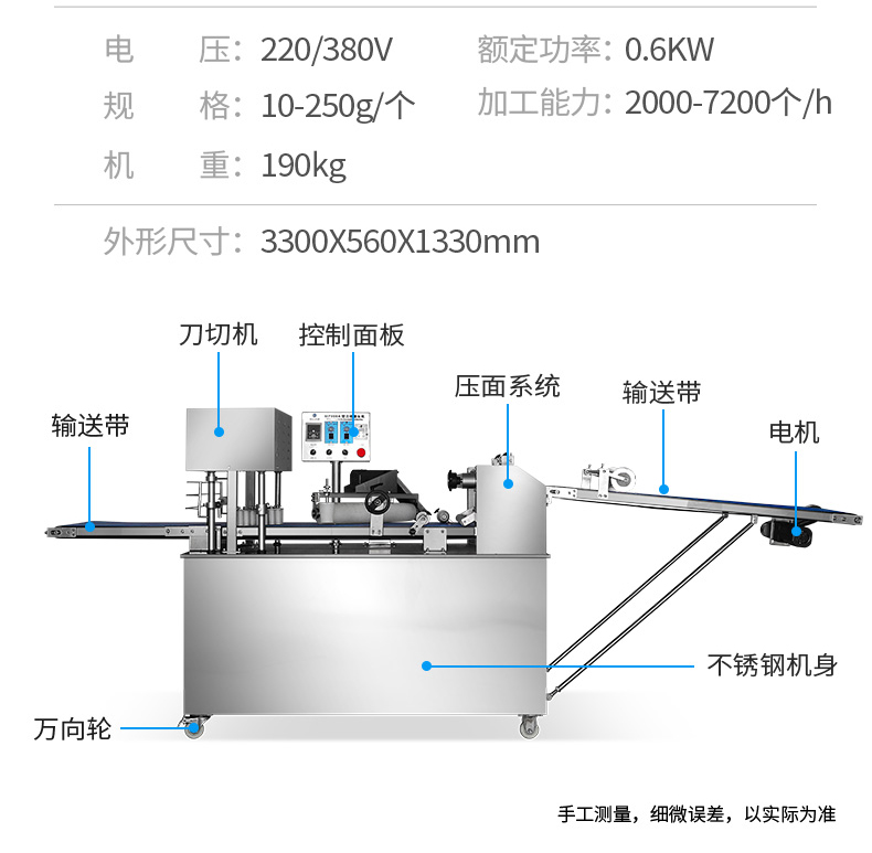?自動(dòng)化程度高,定量準(zhǔn)確,制品大小統(tǒng)一,饅頭面帶厚度、成型、切段大小均可隨意調(diào)控;