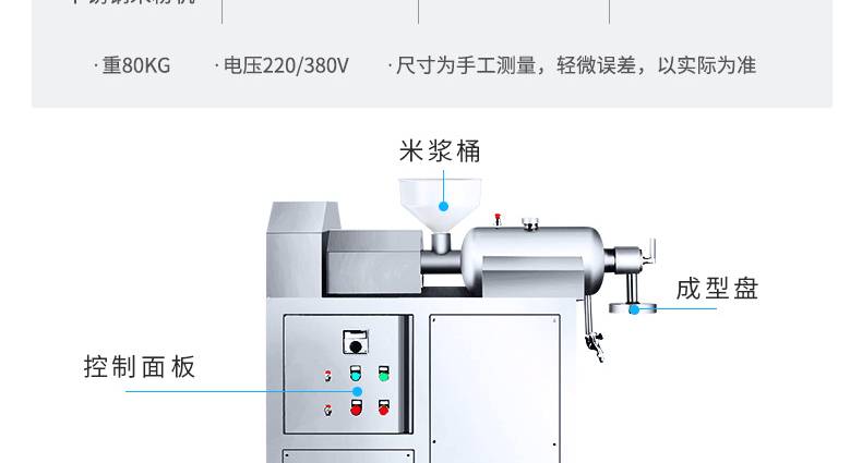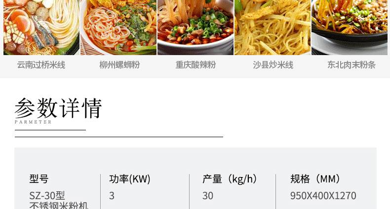 名稱SZ-30不銹鋼米粉機(jī) 電源220/380V 功率3kw 產(chǎn)量30kg/h 尺寸950*400*1270mm 重量80kg 規(guī)格 其他
