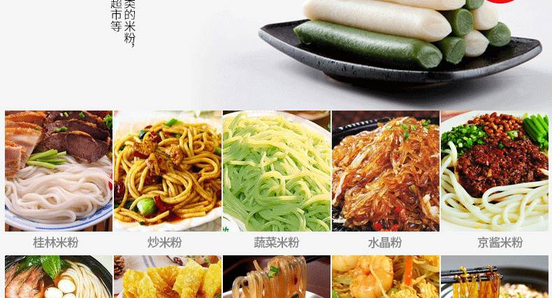 ◆ 不銹鋼米粉機(jī)生產(chǎn)多樣性可生產(chǎn)米粉、米線、粉絲、粉條、年糕、玉米面條、各種雜糧粉絲、各種面條、雜糧面條、彩色面條以及以紅薯、玉米、大豆、蠶豆等制成淀粉為原料的等多種食品而且每種食品厚薄、粗細(xì)等規(guī)格可根據(jù)需要任意調(diào)整。