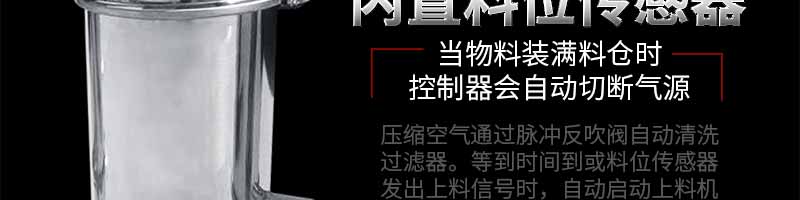 當(dāng)壓縮空氣供給真空發(fā)生器時,真空發(fā)生器就產(chǎn)生負壓形成真空氣流,物料被吸入吸料咀,形成物氣流,經(jīng)過吸料管到達上料機的料倉內(nèi)。過濾器把物料與空氣分離,當(dāng)物料裝滿料倉時,控制器會自動切斷氣源,真空發(fā)生器停止工作,同時料倉門自動開啟,物料落到設(shè)備的料斗中。與此同時,壓縮空氣通過脈沖反吹閥自動清洗過濾器。等到時間到或料位傳感器發(fā)出上料信號時,自動啟動上料機。