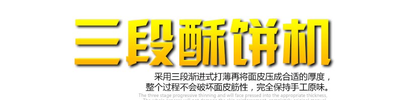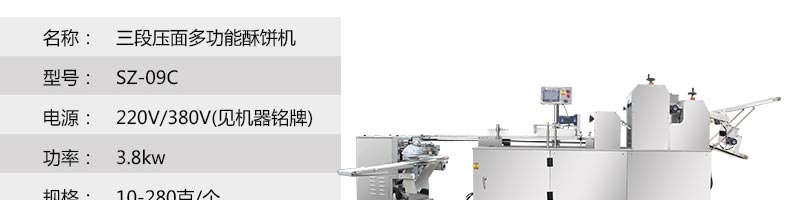 名稱SZ-09C三段壓面酥餅機(jī) 電源220/380V(見機(jī)器名牌) 功率3.8kw 產(chǎn)量0-3600個(gè)/小時(shí) 尺寸3200×840×1630mm 重量700kg 規(guī)格10-100克/個(gè) 其他