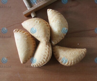 面粉用沸水燙成熟面,與糯米粉揉勻成粉團,搓條,摘劑,掀成皮子。將細豆沙餡,豬板油丁和糖分別包入皮子,對折成半月形餃子,放入油鍋,炸至金黃色撈起。